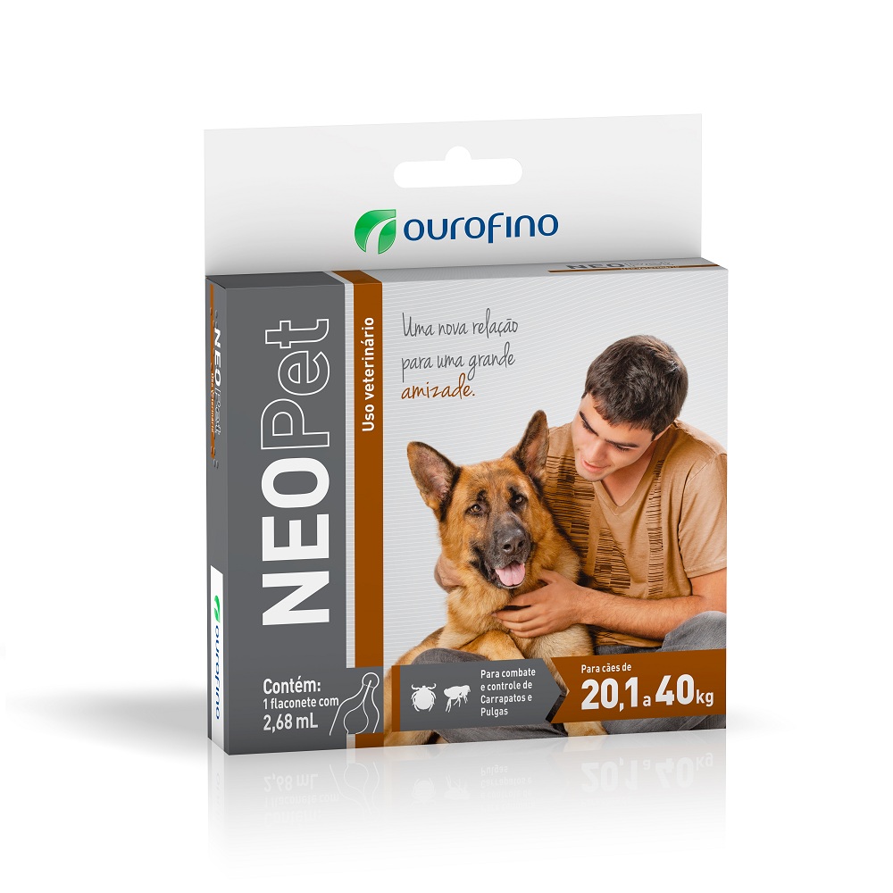 O Antipulgas e Carrapatos Neopet Ourofino Cães 20,1kg a 40Kg é um produto de uso tópico indicado para o combate e controle de infestações causadas pelos ectoparasitas pulgas e carrapatos. Deve ser aplicado exclusivamente pela via tópica. Certifique-se de que o volume do flaconete a ser aplicado é compátivel com o peso corporal do animal a ser tratado. Contém um aflaconete de 2,68ml.