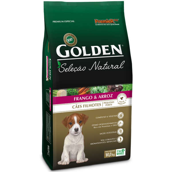 Ração Golden Premier Pet Seleção Natural para Cães Filhotes Mini Bits contém complexo de 6 vegetais, como fonte de fibras e sais minerais, baixo teor de sódio para ressaltar o sabor natural dos ingredientes, sem corantes e aromatizantes artificiais e sem ingredientes transgênicos